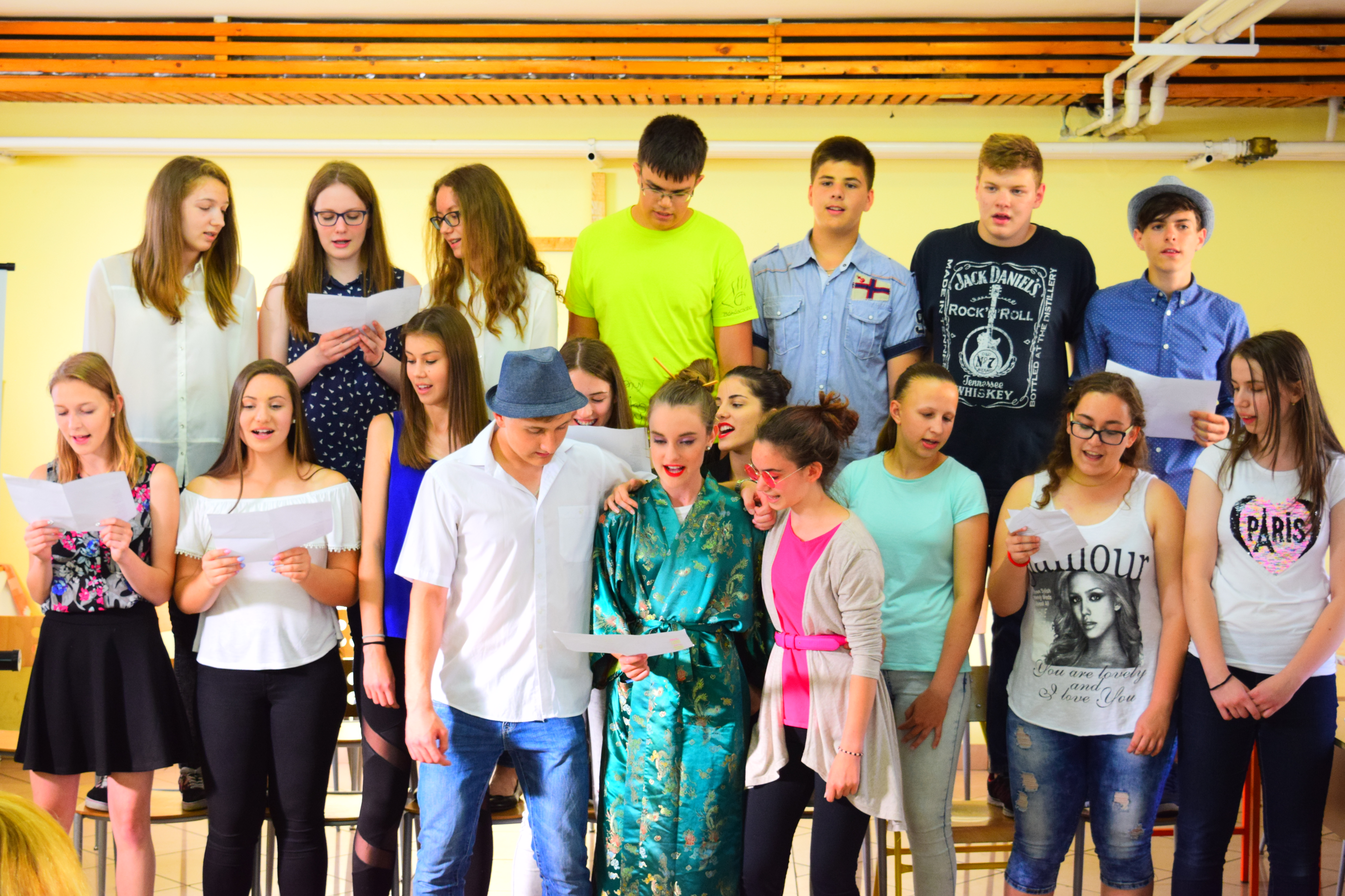 A hangulat már az előadás előtt is érezhetően jó volt. Különféle jelmezekben, izgatottan és talán kicsit félve vártuk, hogy minden szülő megérkezzen, és megmutathassuk mit is tanultunk idén.  Az izgalomra volt is okunk, mert volt, aki beugróként még csak ekkor tanulta meg szövegét és szép számú nézősereg is érkezett. De a tömeg egyszer csak elhalkult és elkezdődött az előadás. A műsort egy rövid, négy nyelven elmondott köszöntővel nyitottuk meg, majd kettő rövid, angol nyelven előadott párbeszéddel folytatódott előadásunk. Ezt követően egy hosszabb angol nyelvű előadás volt megtekinthető, ami játékosan mutatta be, hogyan csalnak a diákok a vizsgákon. (Természetesen a lebukás itt sem maradt el.) Ezután a német csoport egy videót szeretett volna készíteni a főszereplőnk anyukájának, hogy megköszönjék a zongorát, amit kaptak tőle, de ez a darab forgatókönyve szerint csak kisebb sikerrel valósult meg.