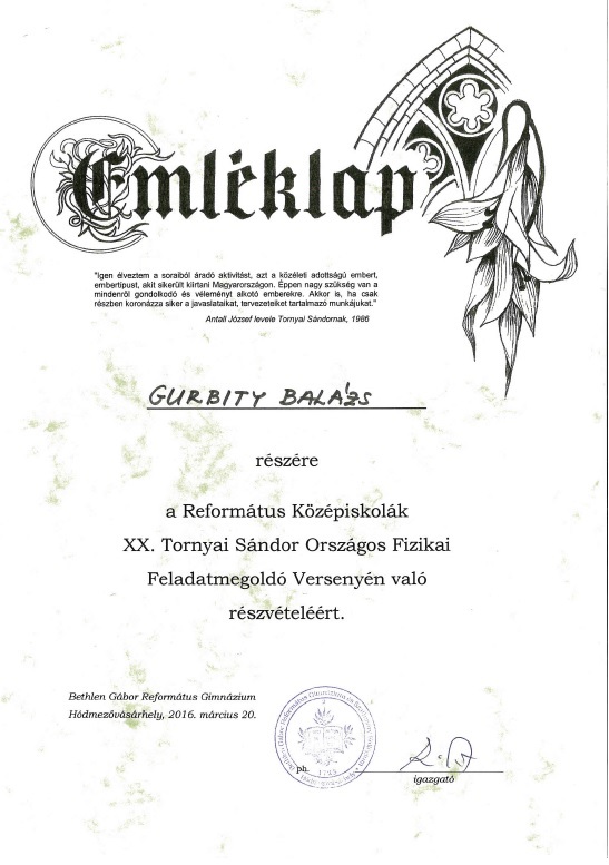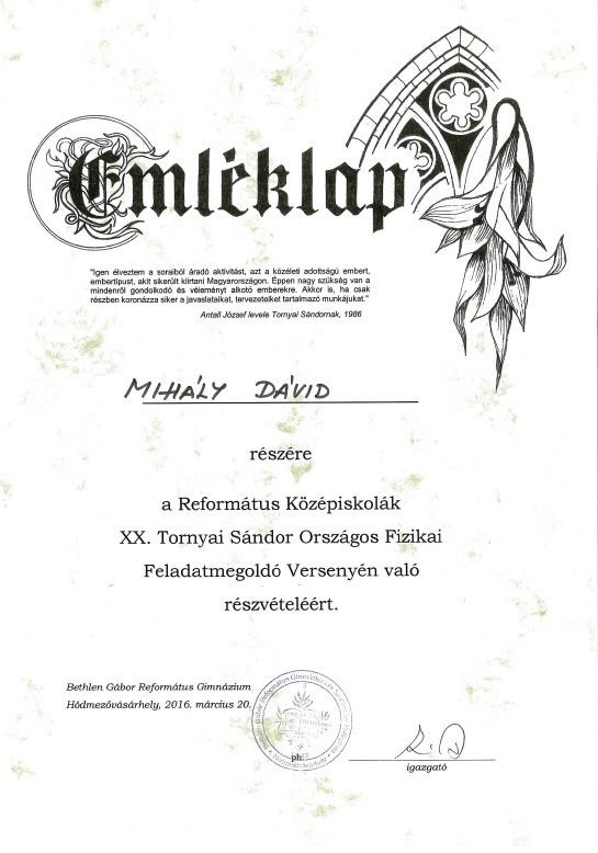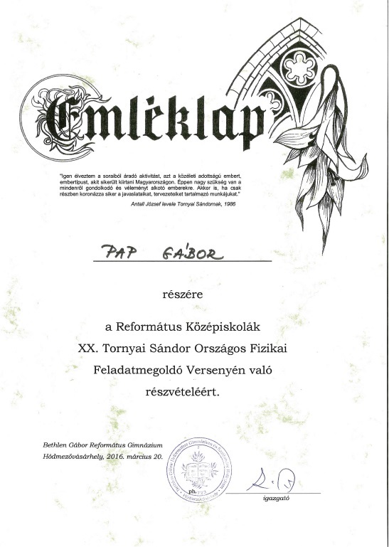 Köszönjük diákjaink munkáját, gratulálunk az elért eredményeikhez! Jövőre ismét megmérettetjük magunkat. PLAVECZ Zoltán fizika tanár