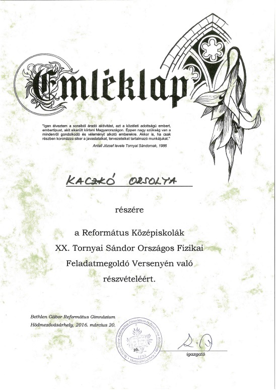 Iskolánk ebben a tanévben is részt vett a református iskolák számára rendezett XX. Tornyai Sándor Országos Fizikai Feladatmegoldó Versenyen.