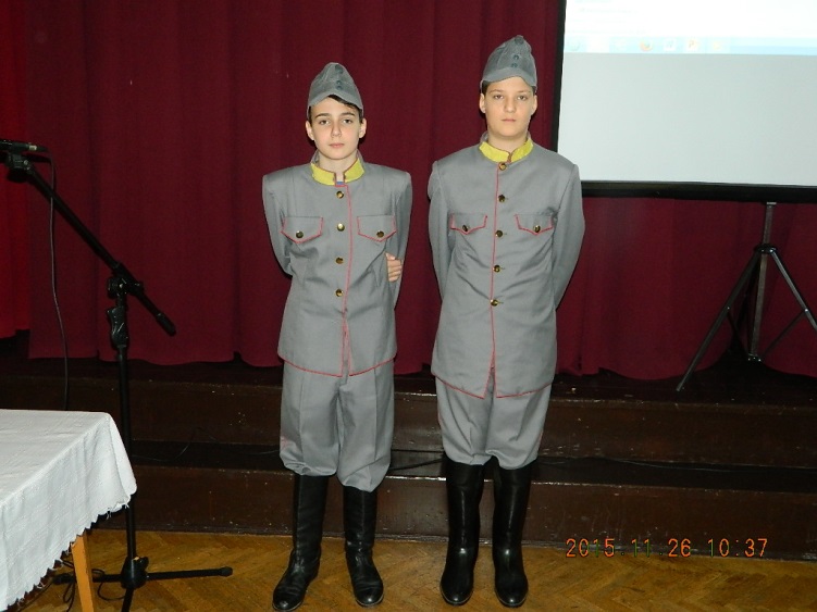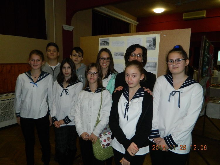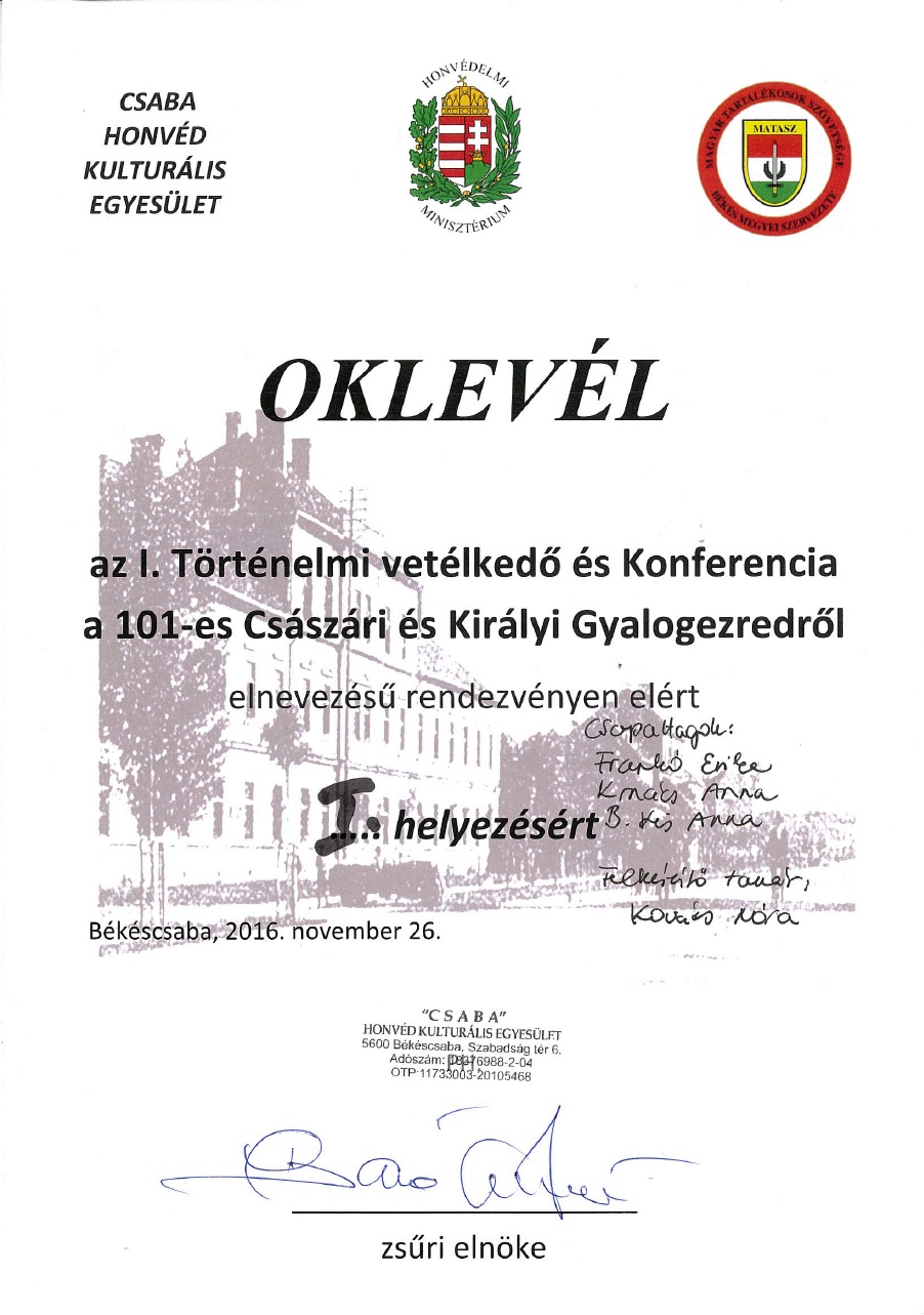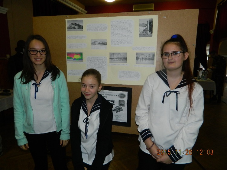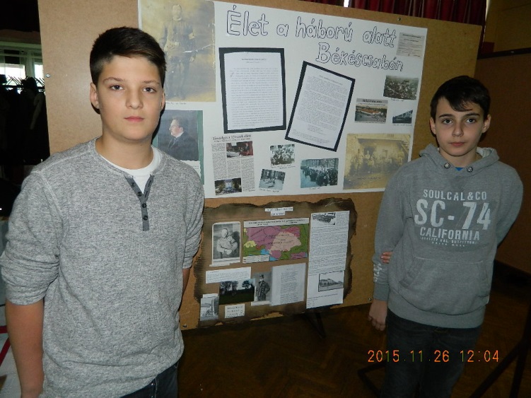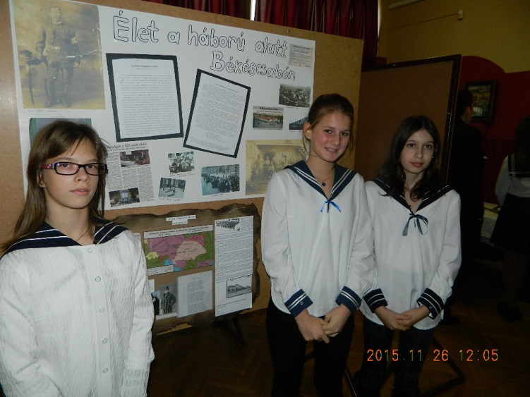 A 2015. november 27-i péntekre sok diákunk készült lelkes, odaadó munkával és szorgalommal. A 6.a, a 6.b, a 7.a és a 7.b tanulói beleásták magukat az első világháború, a katonai hadmozdulatok, a hátország korabeli világába, hogy a konferencia és verseny mezőnyében jól szerepeljenek. Az internet adta lehetőségek eddig ismeretlen helyekre és időkbe kalauzolták el diákjainkat. Sok eredeti írott, képi forrást találtak, sokan saját családjuk emlékei között kutatva bukkantak őseik hősi tetteire: dédapák, ükszülők tettei elevenedtek meg előbb fogalmazások lapjain, majd prezentációk diáin. A felkészülés részeként minden csapat előzetesen egy tablót is készített, amelyen összegyűjtötte a témához kapcsolódó legfontosabb információkat. Magán a versenyen azonban csak a 7.b osztály három csapata vett részt: Jakab Luca, Nagy Éva, Kindling Nikolett (1. kép), Krnács Anna, B. Kis Anna, Frankó Erika (2. kép), Vas Botond, Kőszegi Kristóf (3.kép)