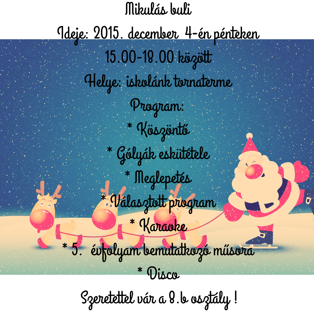 2015. december 4-én tartottuk a hagyományos Mikulás bulinkat az 5-8. évfolyamosok számára. Az 5. évfolyam gólyafogadalma után, idén dobozban érkezett a Télapó mókás krampuszok kíséretében. A meglepetés után, a gyerekek választott programokon vettek részt. Lehetőségük volt kincset keresni, mézeskalácsot díszíteni, gyertyát készíteni, karácsonyi hangulatú sminket alkotni, illetve a sorversenyen és táncban jeleskedni. Ezt követően az ötödikeseké lett a főszerep, hiszen kreatív műsor formájában mutatkoztak be. Minden buli nélkülözhetetlen eleme a karaoke – ez itt sem volt másképp – az osztályok osztályfőnökeikkel együtt énekelhettek. Majd a résztvevők egy közös, mókás tánccal hangolódhattak rá a diszkóra.