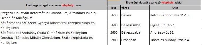 Békés megyében a kijelölt középiskolák: