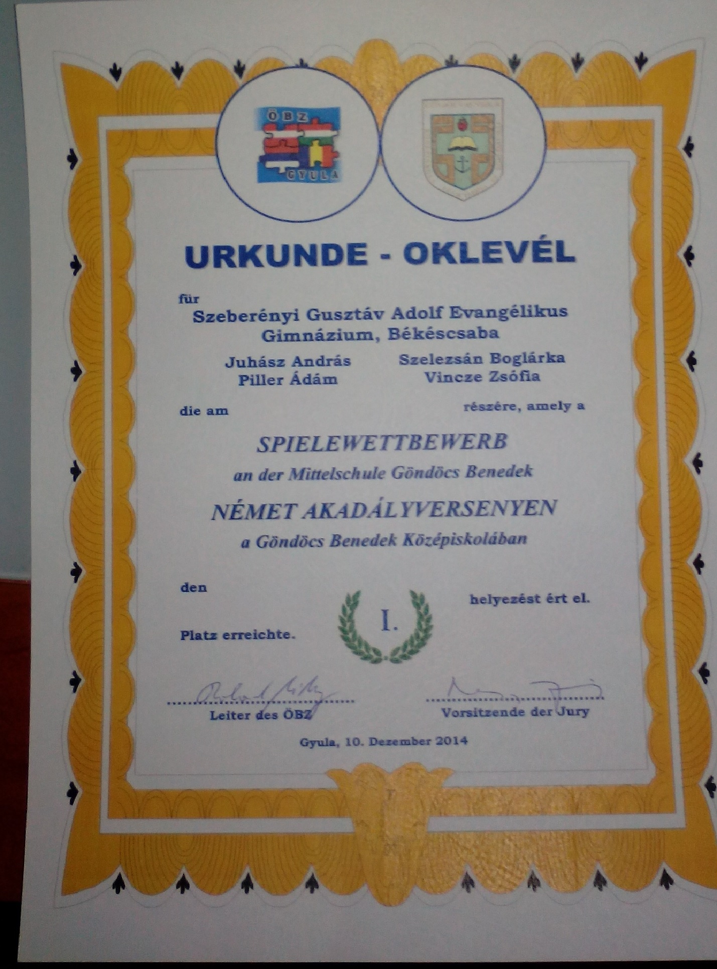 2014. december 10-én, Gyulán, a Göndöcs Benedek Középiskolában rendezték meg a német nyelvi akadályversenyt, ahol iskolánk is képviseltette magát egy csapattal. A versenyen 19 csapat (6-8. osztályosok) vett részt, Békés megye különböző általános iskoláiból.  A 8.b osztály csapata a jó hangulatú megmérettetésen az 1. helyen végzett! A gyerekek sok élménnyel és ajándékokkal lettek gazdagabbak.