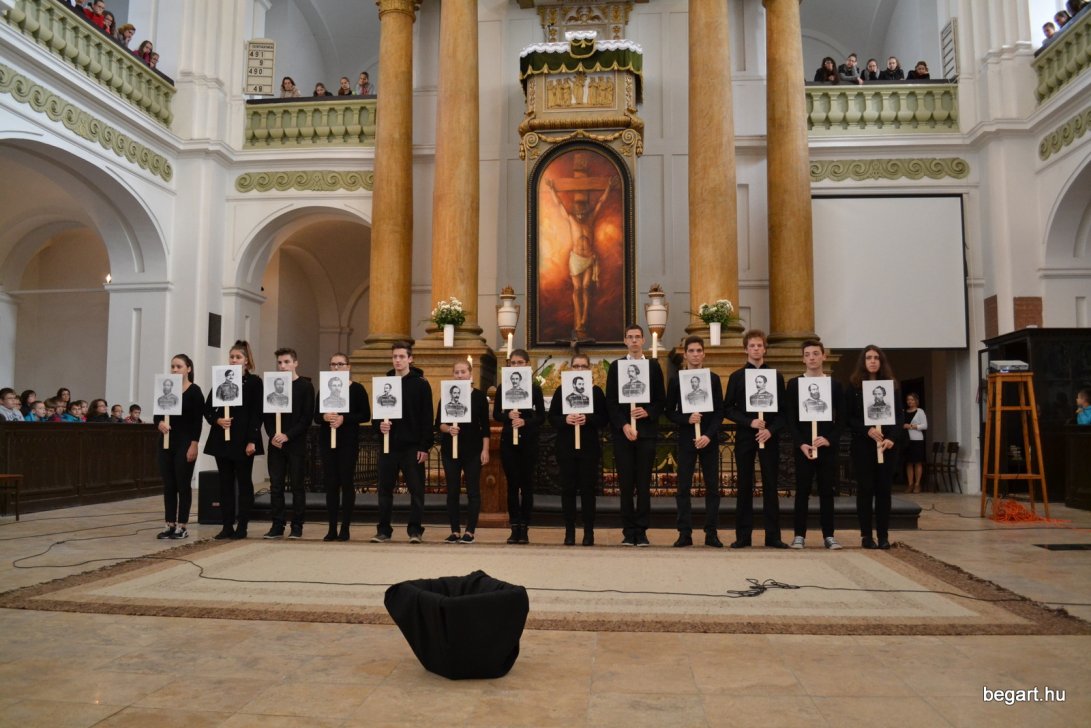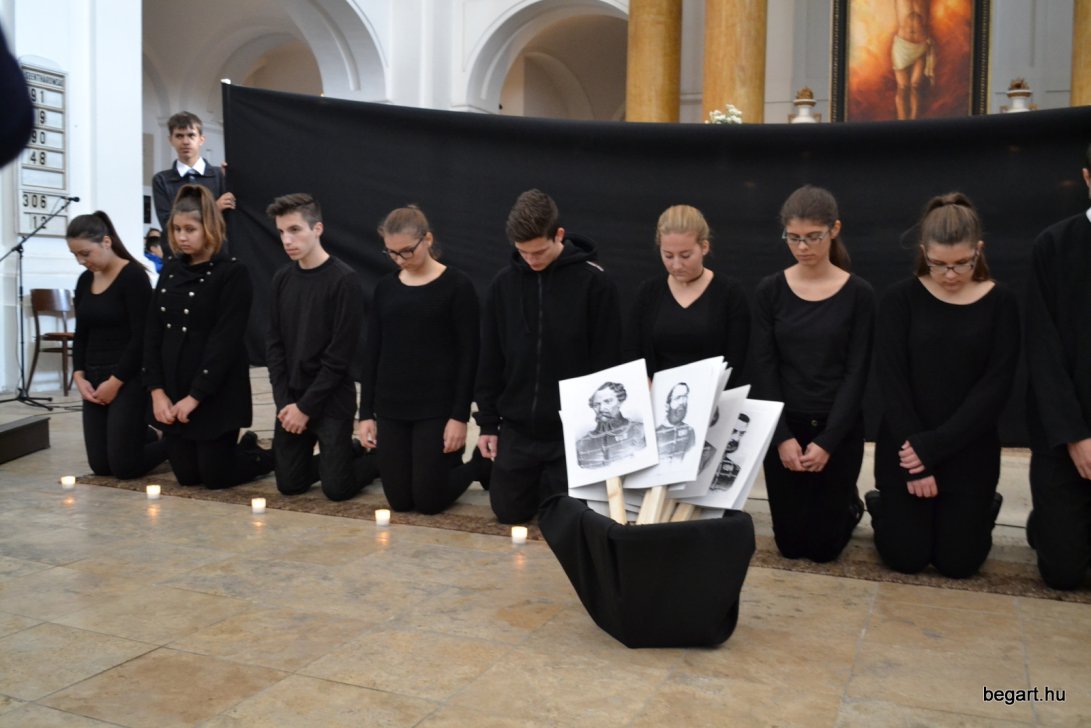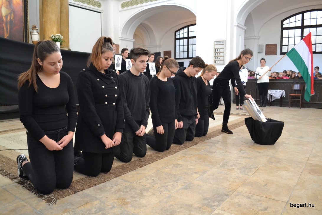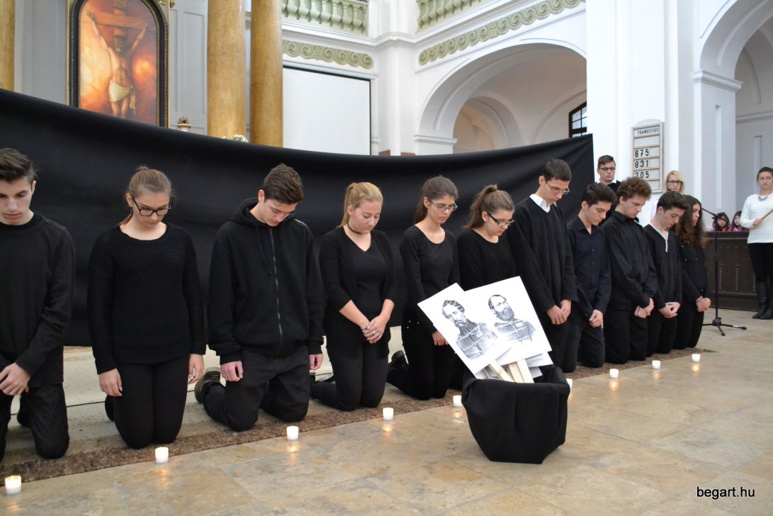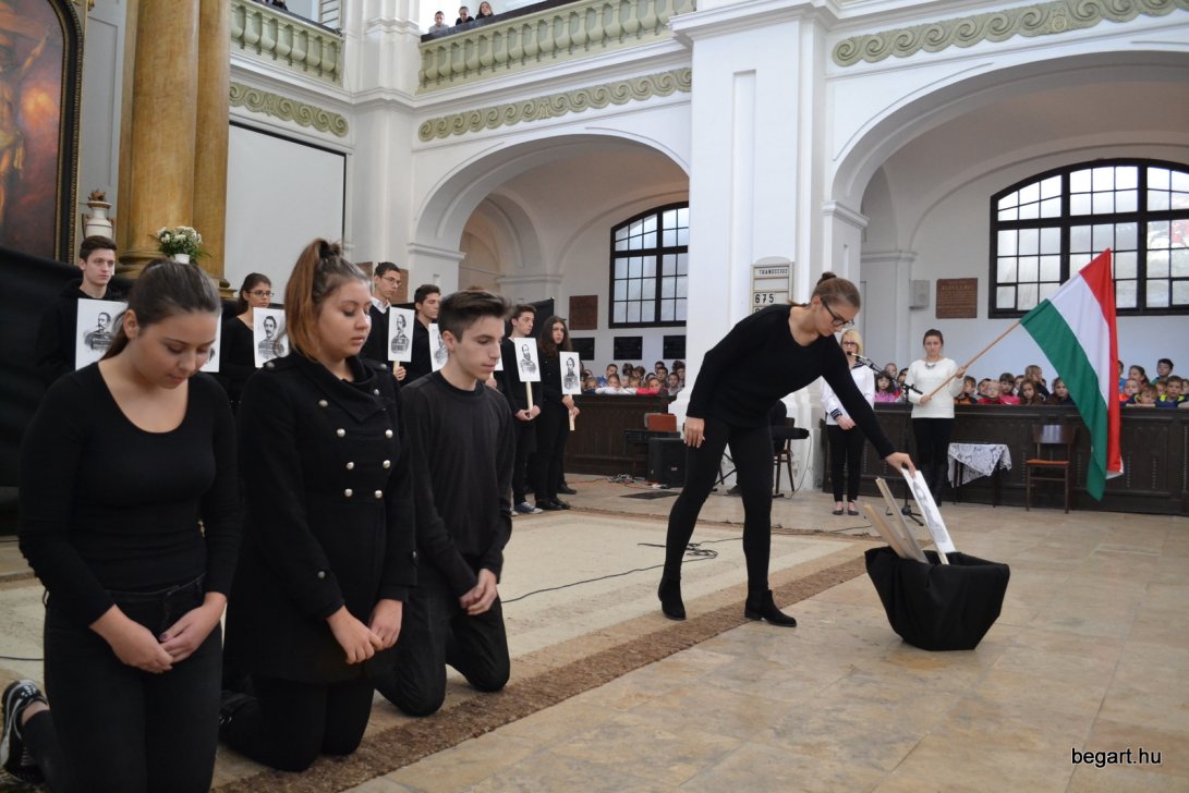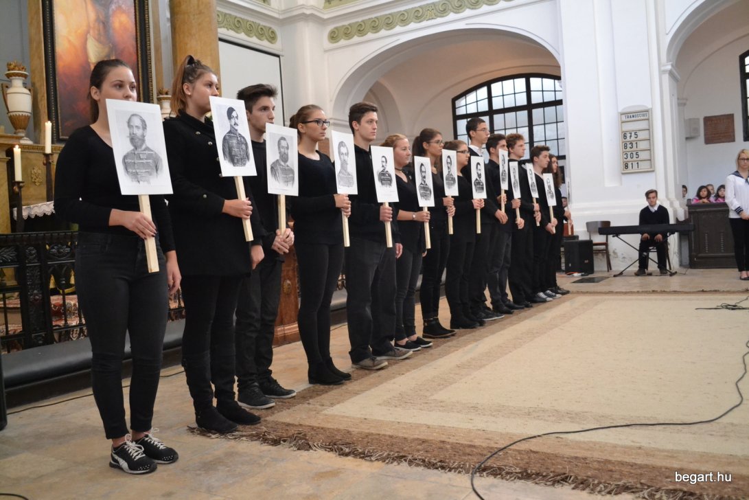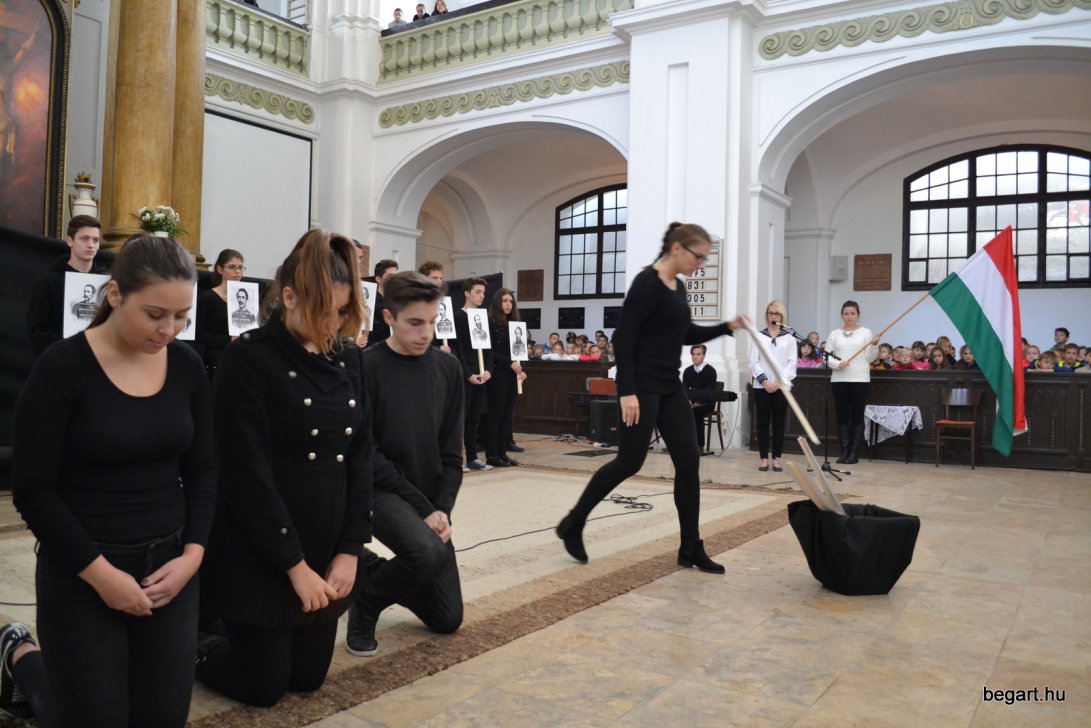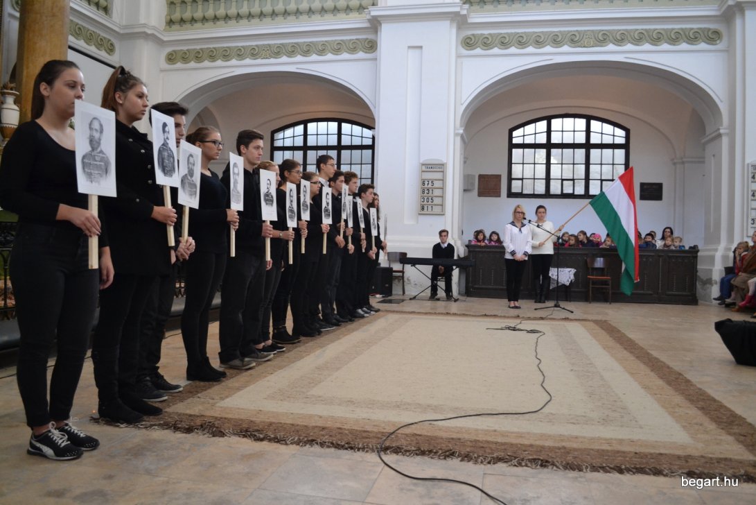 A 10.F és a 9.C osztály diákjainak közreműködésével tiszteletünket fejeztük ki irántuk műsorunk keretein belül. Ezt követően iskolánk képviselőivel elhelyeztük koszorúnkat a 13 aradi vértanú számára kialakított emlékhelynél. Halász Alexandra iskolalelkész