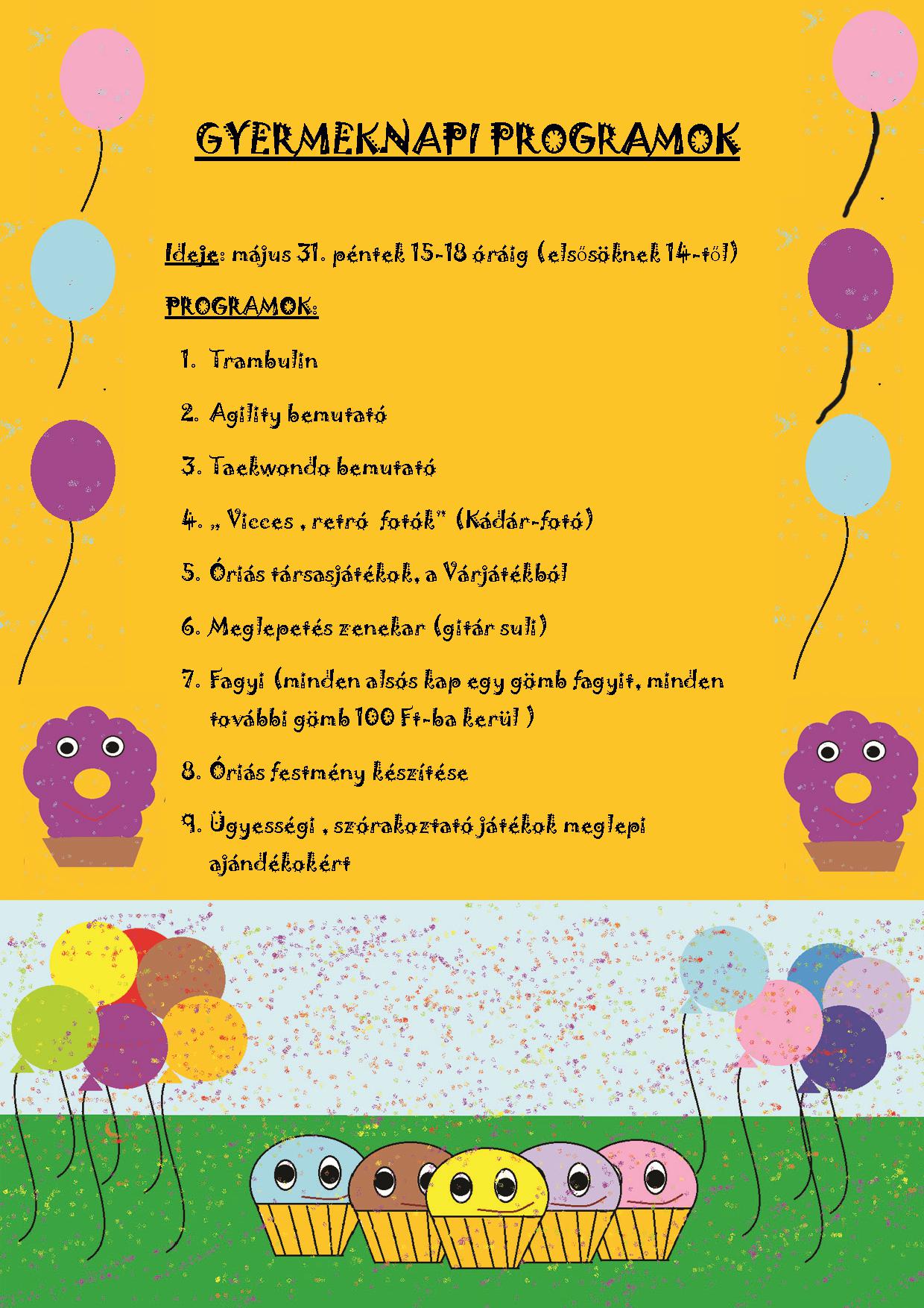 Sok-sok program várta a kisebb diákokat a május 31-i gyereknapon. A szülői munkaközösség az alsós osztályfőnöki munkaközösség és a diákönkormányzat közösen szervezte a vidám, tartalmas szórakozást nyújtó délutánt. Elsőseink is meghívást kaptak erre az eseményre. Ők is aktívan részt vettek a programokon.