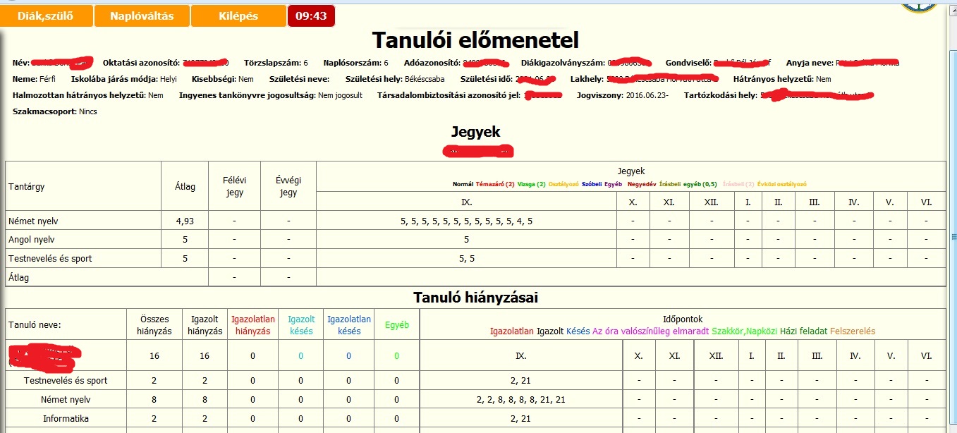 Belépés után rögtön a gyermekük előmenetelét látják. Alapadatok, érdemjegyek, hiányzások.