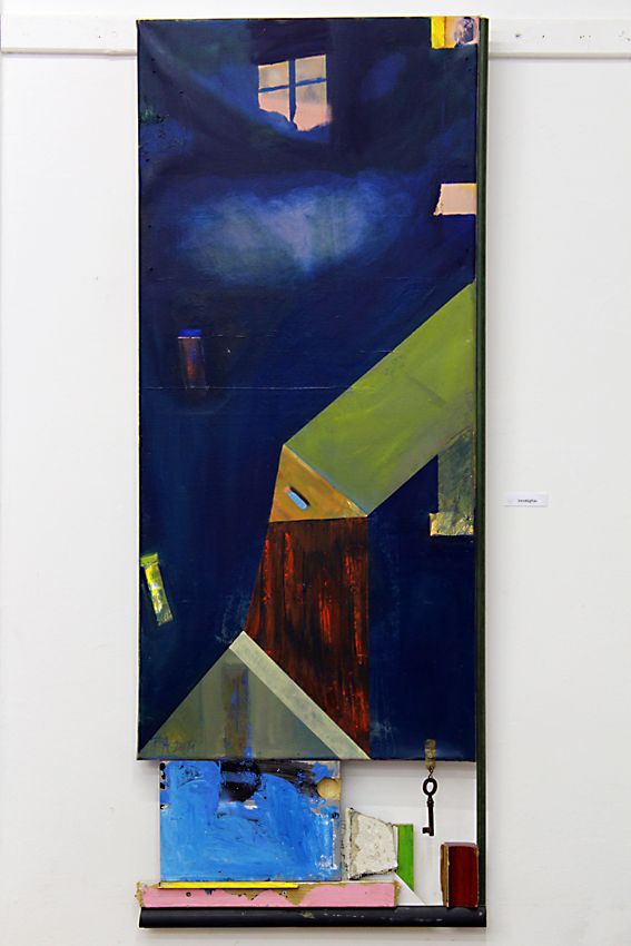 – Nagyon sok “talált tárgyat” használ munkáiban tanár úr. Kíváncsi lennék, hogy először a kép ötlete születik-e meg és utána keres tárgyakat hozzá, vagy egy-egy tárgy ösztönzi az alkotásra? A legtöbb kiállított mű egyfajta képregényként is “olvasható”. Mindenki egy kis szemlélődés után összerakhatja magának a történetet. Ez persze mindenkinél kicsit más lehet. Másfajta hatást tett rám viszont a “Juss” című kép, ahol nem is akartam egy összefüggő történetet “kiolvasni”. Ez az alkotás az erôteljes festôi eszközeivel fogott meg.