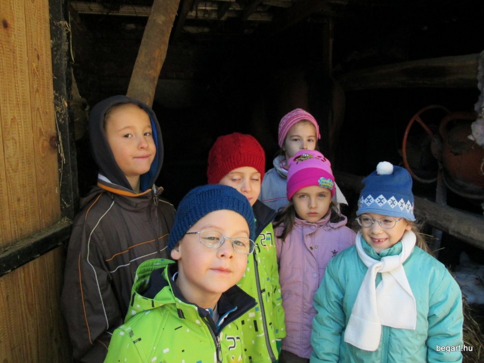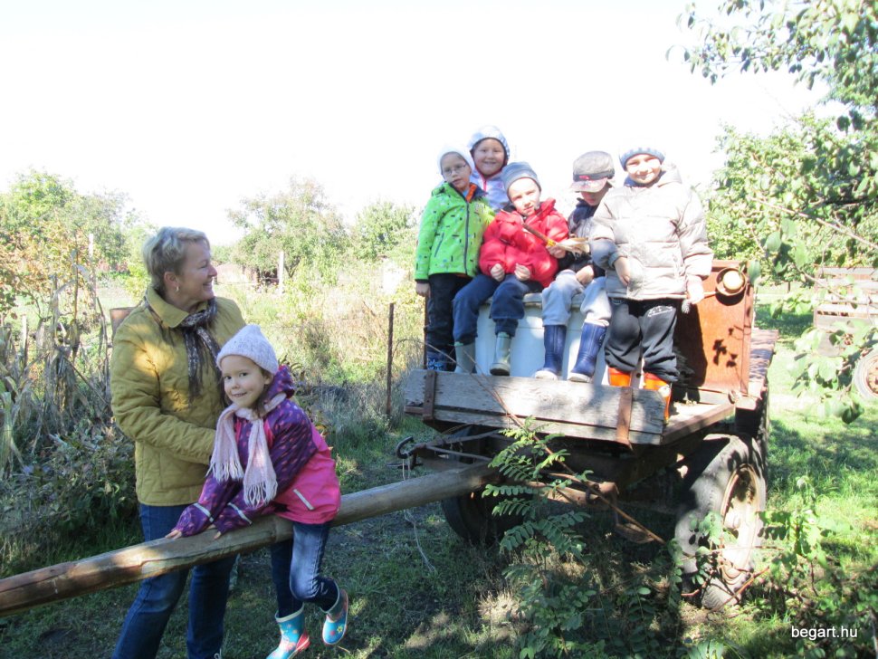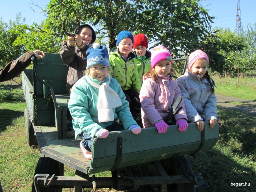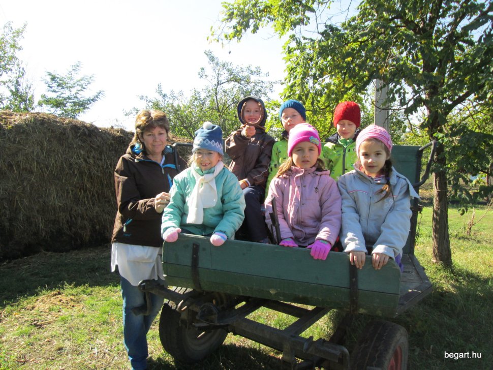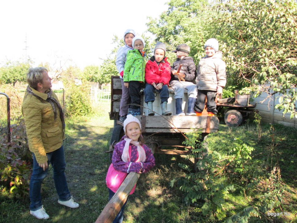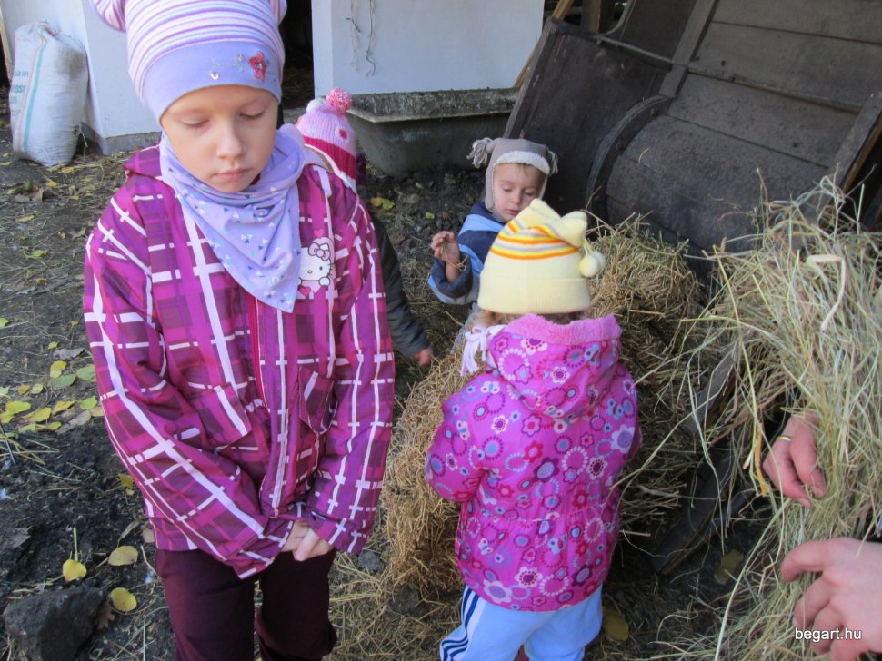Gabi bácsi mikrobusszal vitte és hozta a hatos csoportokat (köszönet érte) és így forgórendszerben nézhettük a sok állatot. Láttunk tehenet, lovat, pónit, kecskét, birkát, disznót, háziszárnyasokat. Sok új kifejezést tanultunk, láttunk górét, ültünk kocsin, megnéztük a trágyadombot. Már meg tudjuk különböztetni a szalmát a szénától. Rengeteg kinccsel tértünk vissza az óvodába: gyöngyös tollat, kukoricacsutkát, csuhét, diót, mogyorót gyűjtöttünk. A gyerekek nagyon jól érezték magukat, köszönjük ezt a szép napot!